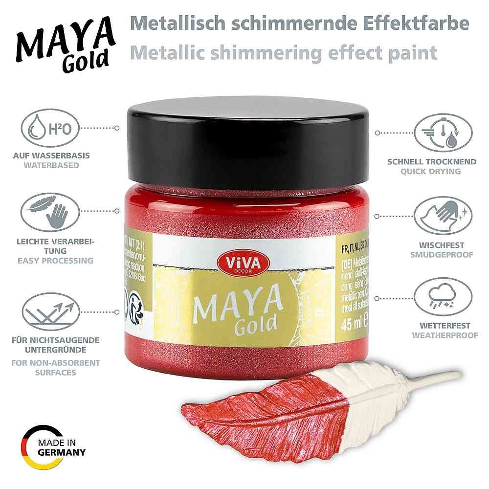 Liquid acrylic paint with an intense glossy and metallic effect Maya-Gold from VIVA DECOR, quick-drying, for absorbent and non-absorbent surfaces, content 45 ml. Paint with a very abundant glossy effect, with an intense depth of metallic color.