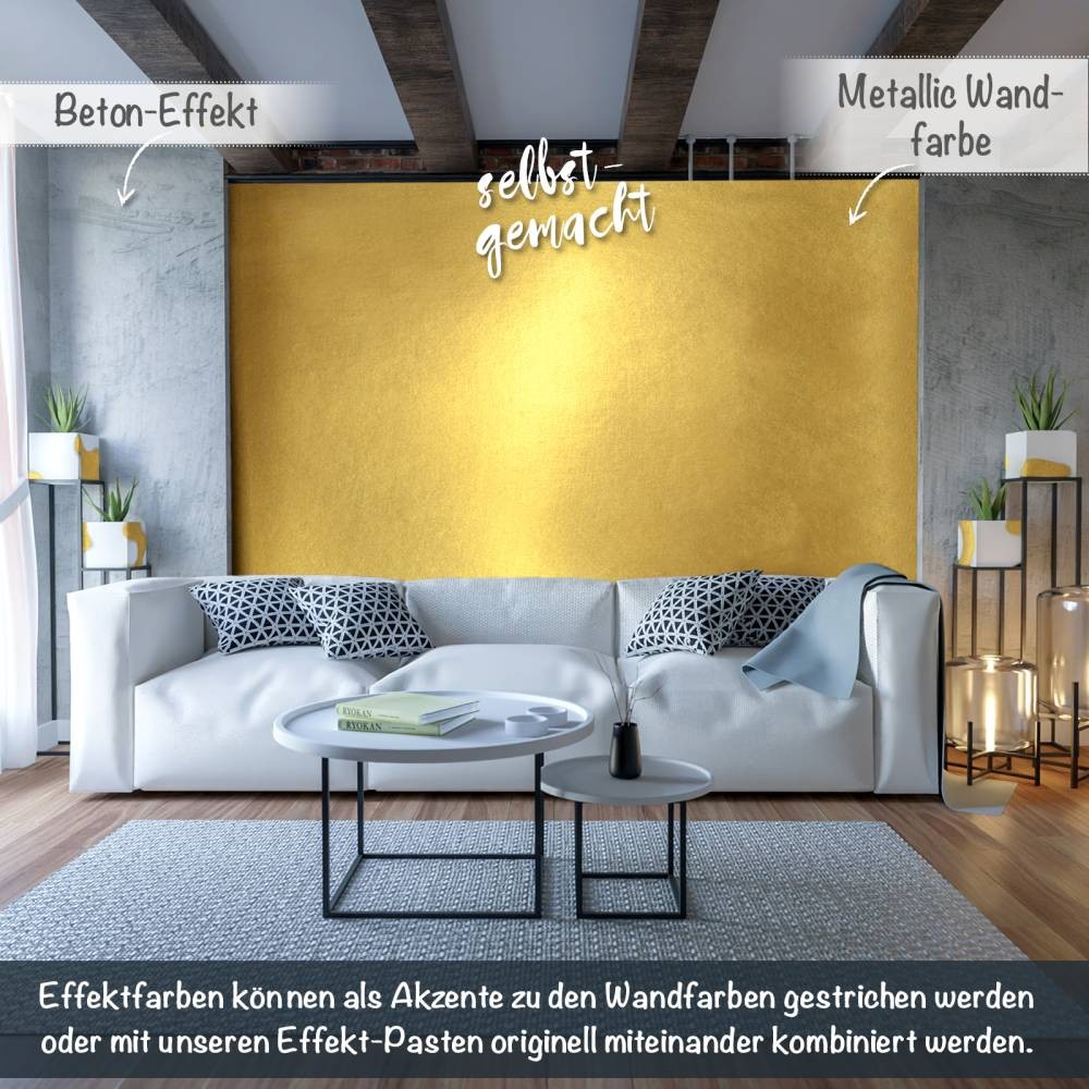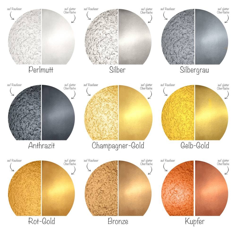 The paint is wipe‑resistant (wischfest), offering excellent adhesion on a wide range of surfaces such as paintable textured wallpaper (Raufaser), non‑woven wallpaper (vlies), plaster, filler, concrete or existing wall paint. Even users with little experience can achieve professional results. Available in multiple metallic shades, it is perfect for living rooms, bedrooms, hallways, offices, studios and commercial interiors that require a durable and authentic metallic effect.