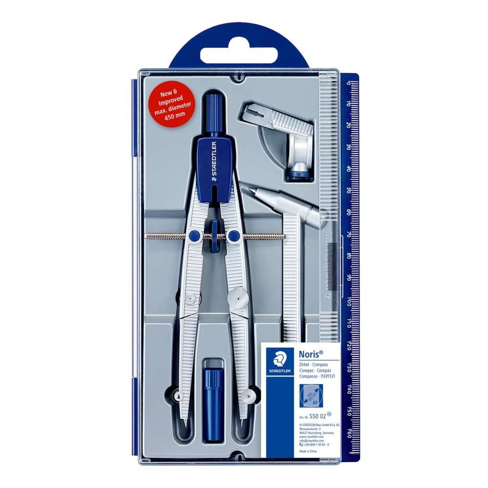 Adjustable metal compass with extension, with pencil adapter, lead set, ruler box, maximum circle diameter of 450 mm, from Staedtler, code 550-02.