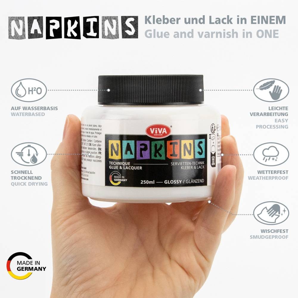 TWO IN ONE - glue and varnish in ONE! The napkin technique glue and varnish is water-based, weatherproof and dries quickly transparent, with a smooth surface.