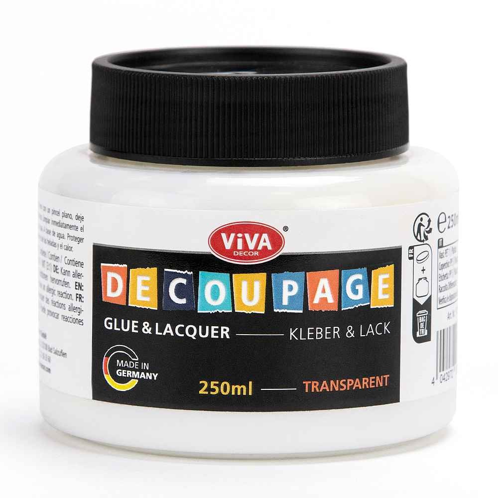 Adezivul și lacul semi-lucios pentru decoupage (tehnica șervețelului) marca VIVA DECOR, este un lac transparent cu uscare la aer, potrivit atât ca adeziv, cât și ca strat protector.