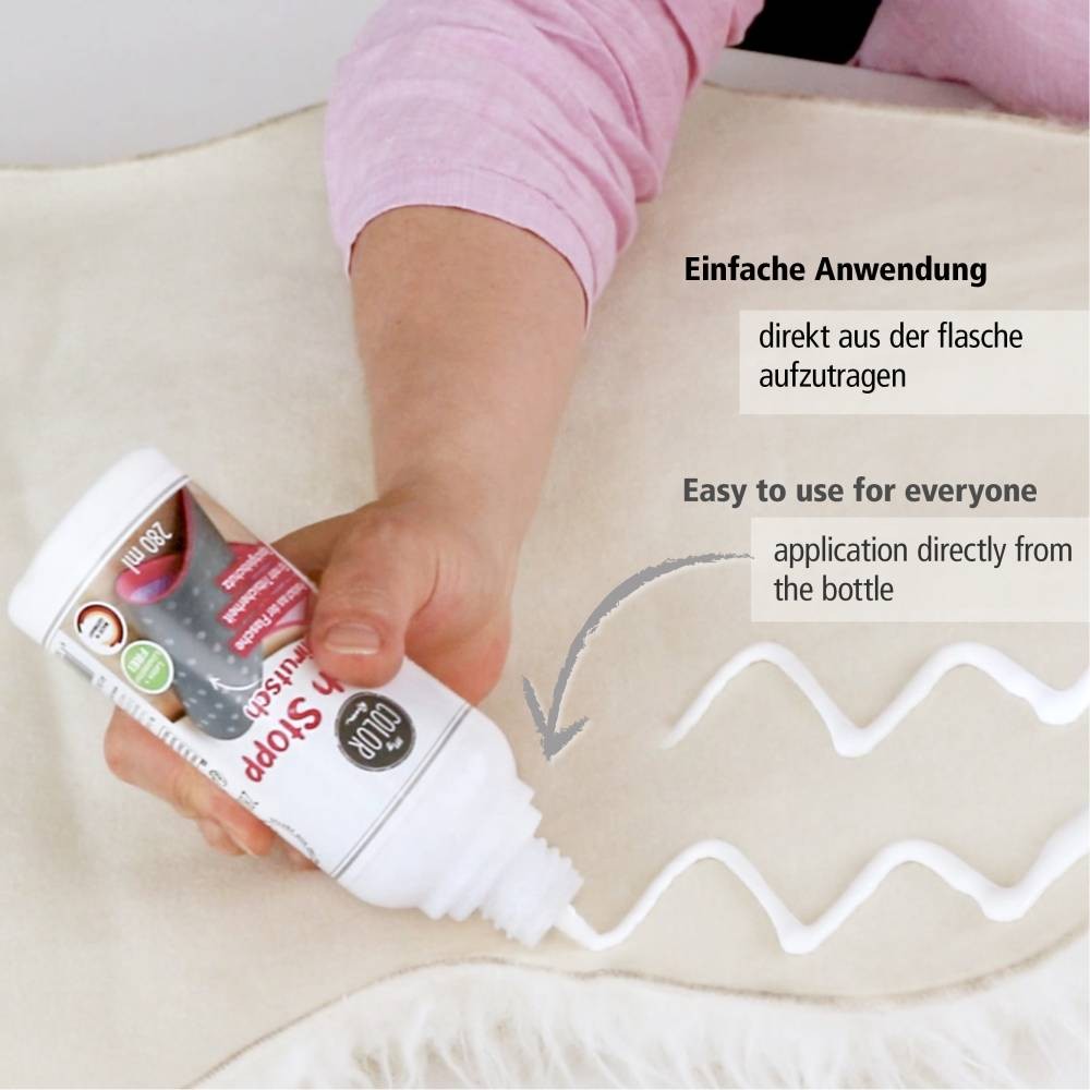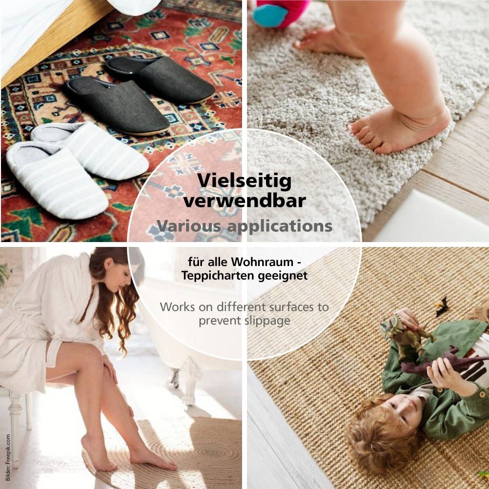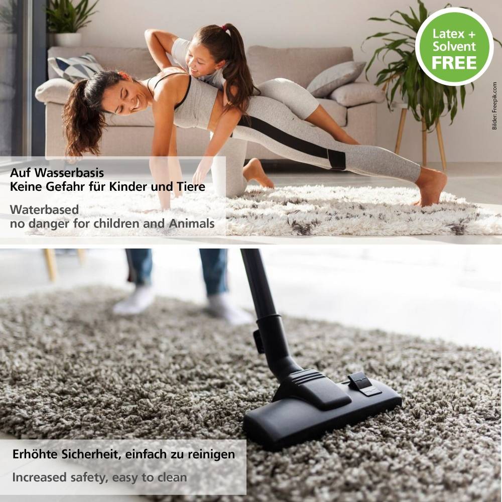 Se aplică produsul pe spatele covorului, în linii sau puncte, folosind aplicatorul inclus. Se lasă la uscat până când pelicula devine transparentă și elastică. Rezultatul este un covor stabil, sigur și fixat în poziție, fără plase sau benzi suplimentare.
