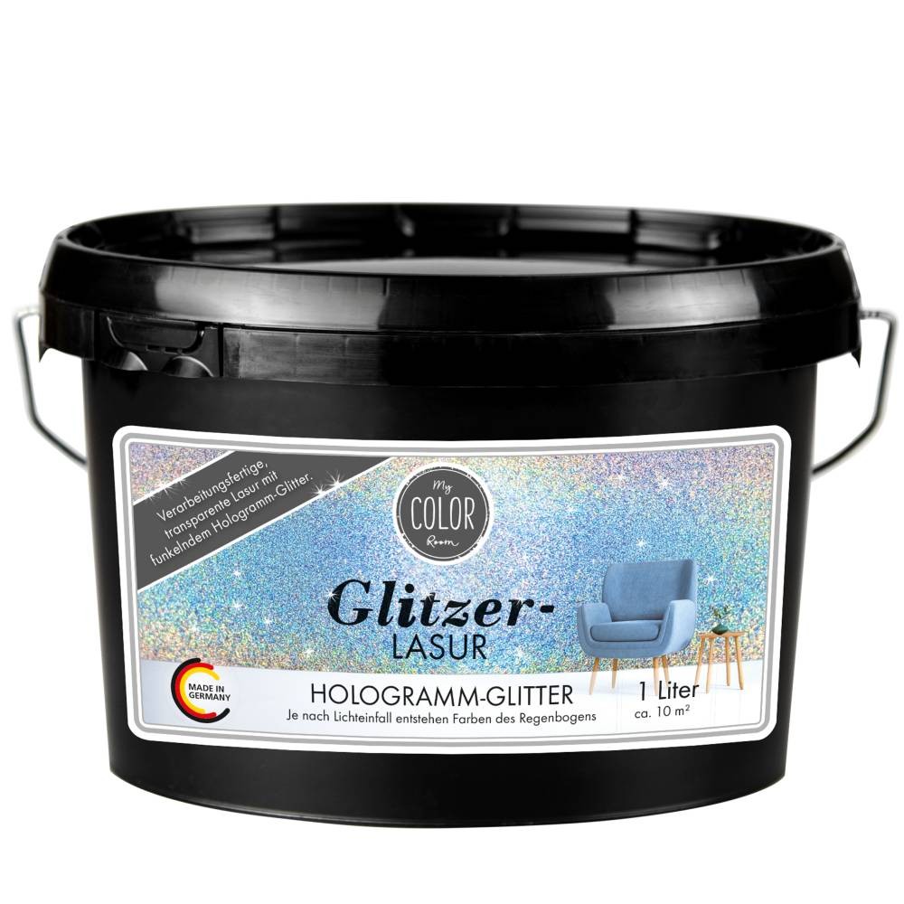 Glazură decorativă lavabilă transparentă cu sclipici, My COLOR Room by Viva Decor, 1 litru, ideală pentru pereți interiori, oferind un efect elegant de glitter și aplicare ușoară.