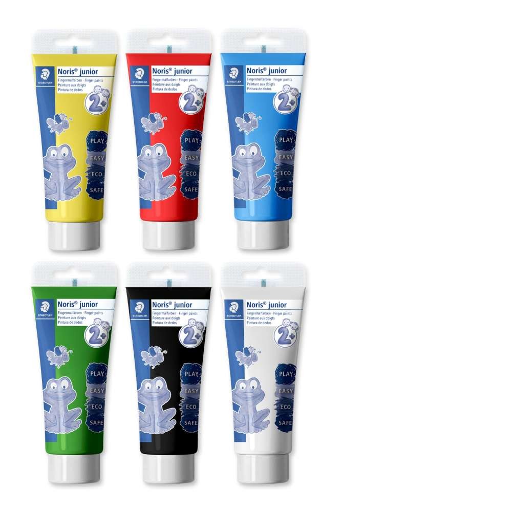 Set 6 culori pentru pictura cu degete, de la Noris Staedtler, pentru copiii începând de la 2 ani, conținut 6 tuburi a câte 75 ml, culori: galben, roșu, verde, albastru, alb și negru.