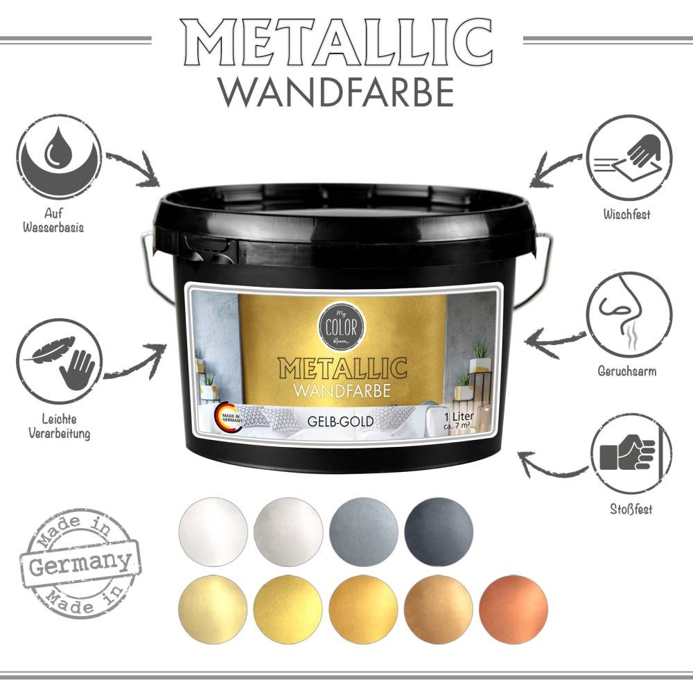 My COLOR Room Metallic Wandfarbe este o vopsea decorativă premium cu efect metalic, fabricată în Germania de Viva Decor, creată pentru a transforma orice interior într-un spațiu modern, elegant și spectaculos. Formula pe bază de apă, fără solvenți și fără plastifianți, oferă o aplicare ușoară, acoperire uniformă și un finisaj metalic intens, cu reflexii dinamice care se schimbă în funcție de lumină și unghiul de privire.