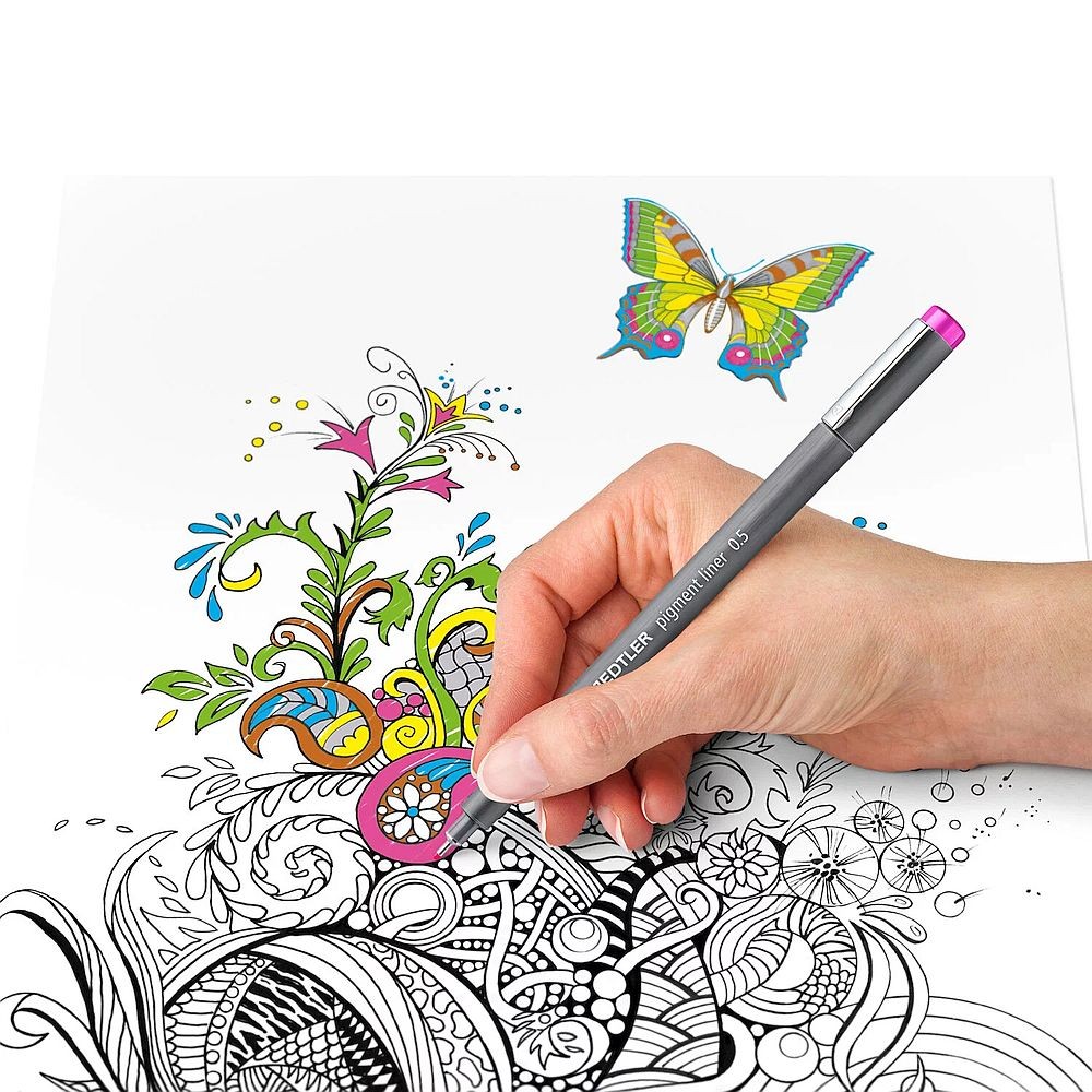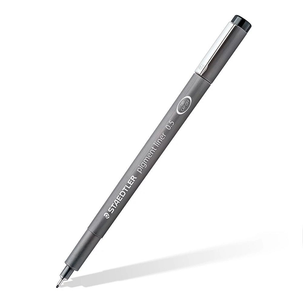 Pigment liner de la Staedtler, finețe de 0,05 mm, cod 308-005, rezistent la apă și UV, pentru scris, desen și schiță, cu vârf metalic lung, ideal pentru folosit cu șabloane și rigle.